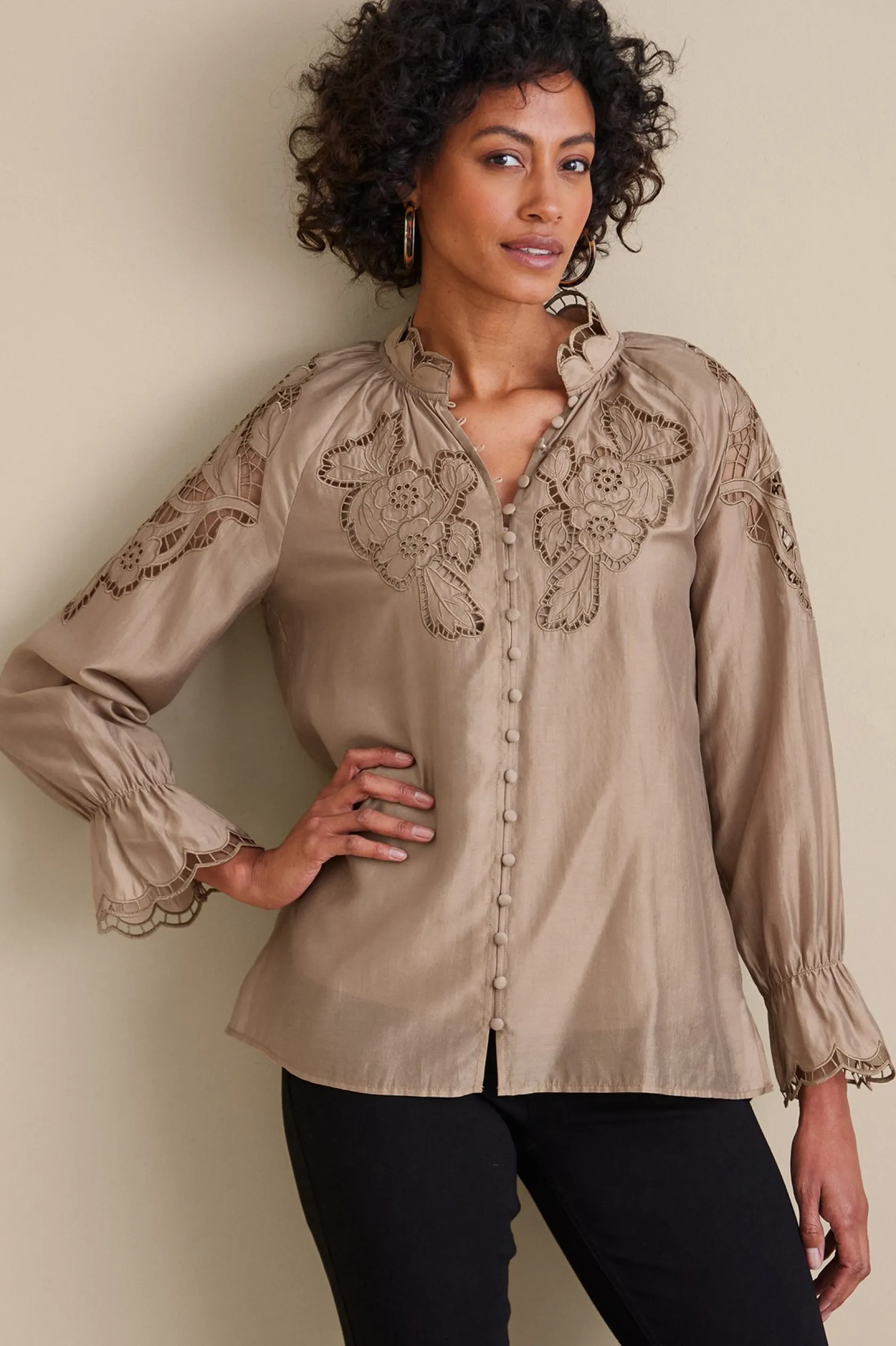 Femininity defined. A subtle golden sheen spotlights the gorgeous cutwork embroidery on this flirty top. Light shirring softens the neck and shoulders. Ruffled bell cuffs are scalloped and embroidered. Covered button and loop placket. Side slits. Includes knit cami.