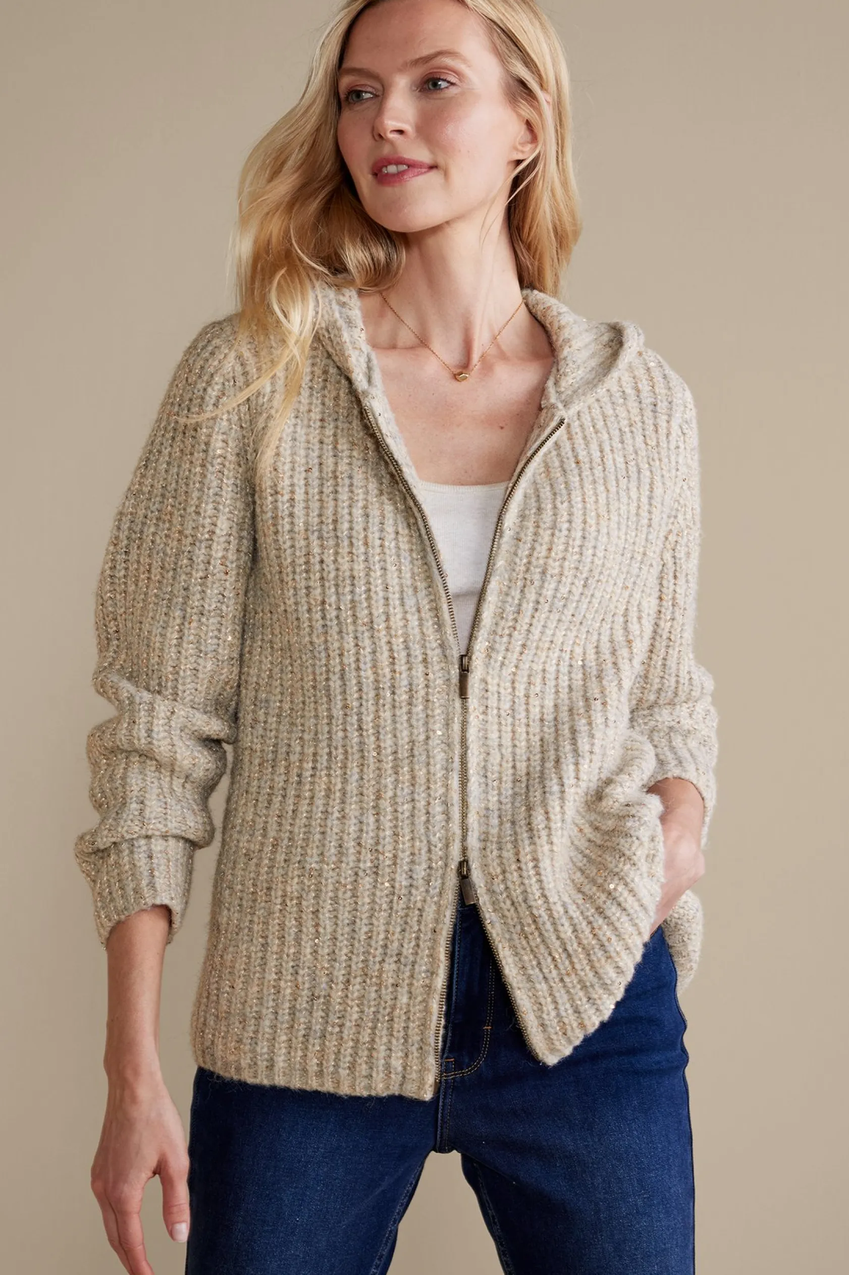 This zip-front, ribbed cardi offers just the right blend of comfort and shine for winter days. The marled yarn mixes ivory and dove grey together with shimmery white-gold thread and tiny sequins. Designed with a relaxed fit and cuddly hood, it’s a covetable, casual essential.
