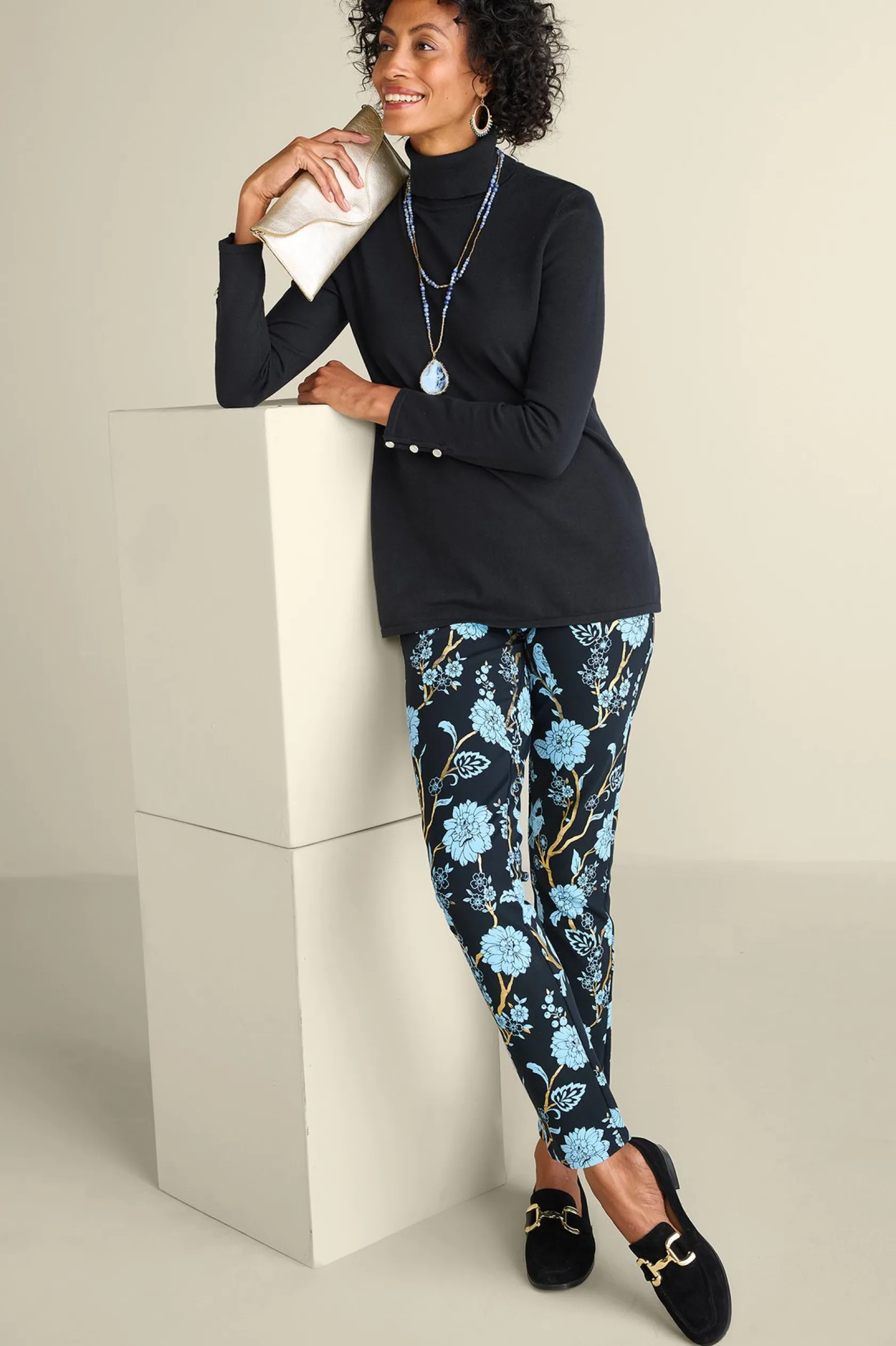 Slit sleeves with button detailing update your new favorite turtleneck sweater. Easy silhouette with side slits.