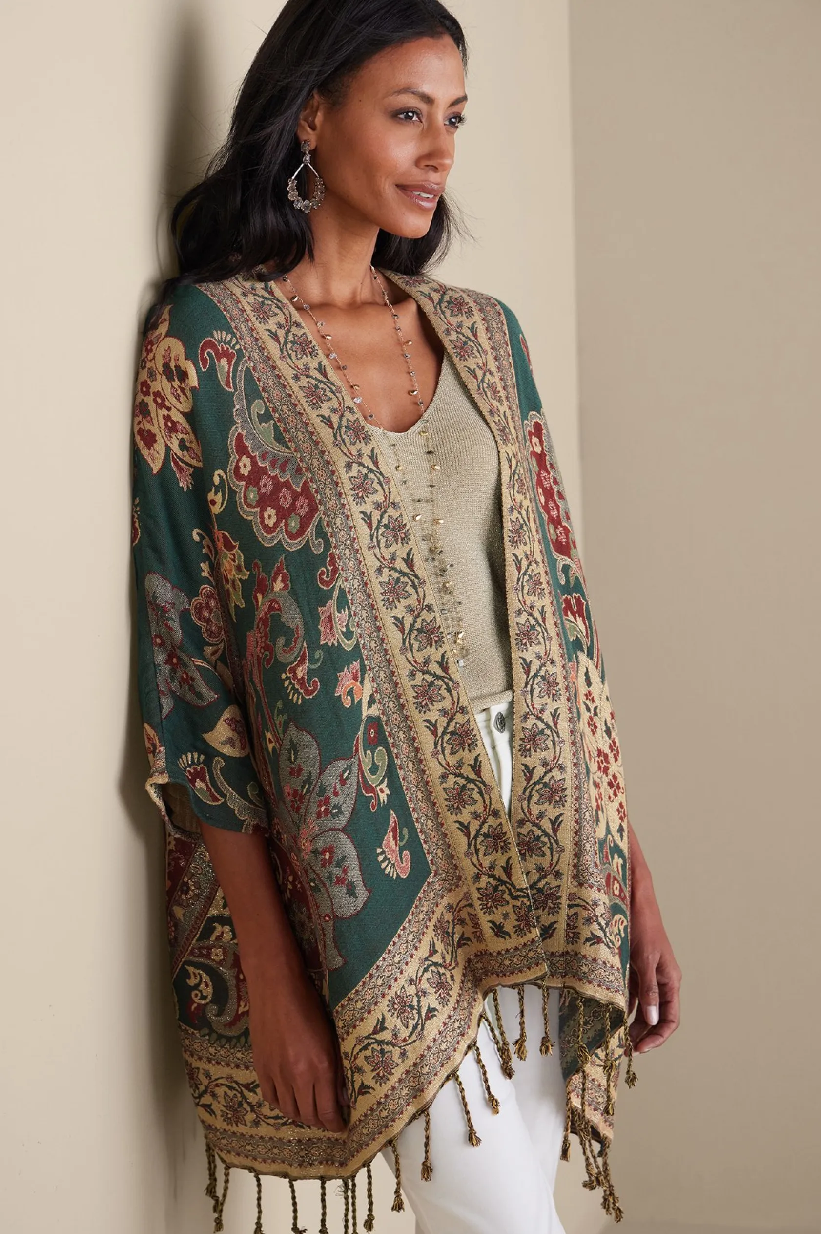 Channeling a carefree Santa Fe sensibility, this shimmering topper is an elegant four-season look. Dress it up for the holidays or pair it with jeans in the warmer months. With a refined hand, the cotton blend jacquard is soft and lightweight in emerald green topped with claret, rose, and sand paisleys. The lightest golden sparkle is woven throughout for a subtle sheen. This relaxed style is finished with a braided tassel hem and easy, 3/4 dolman sleeves.
