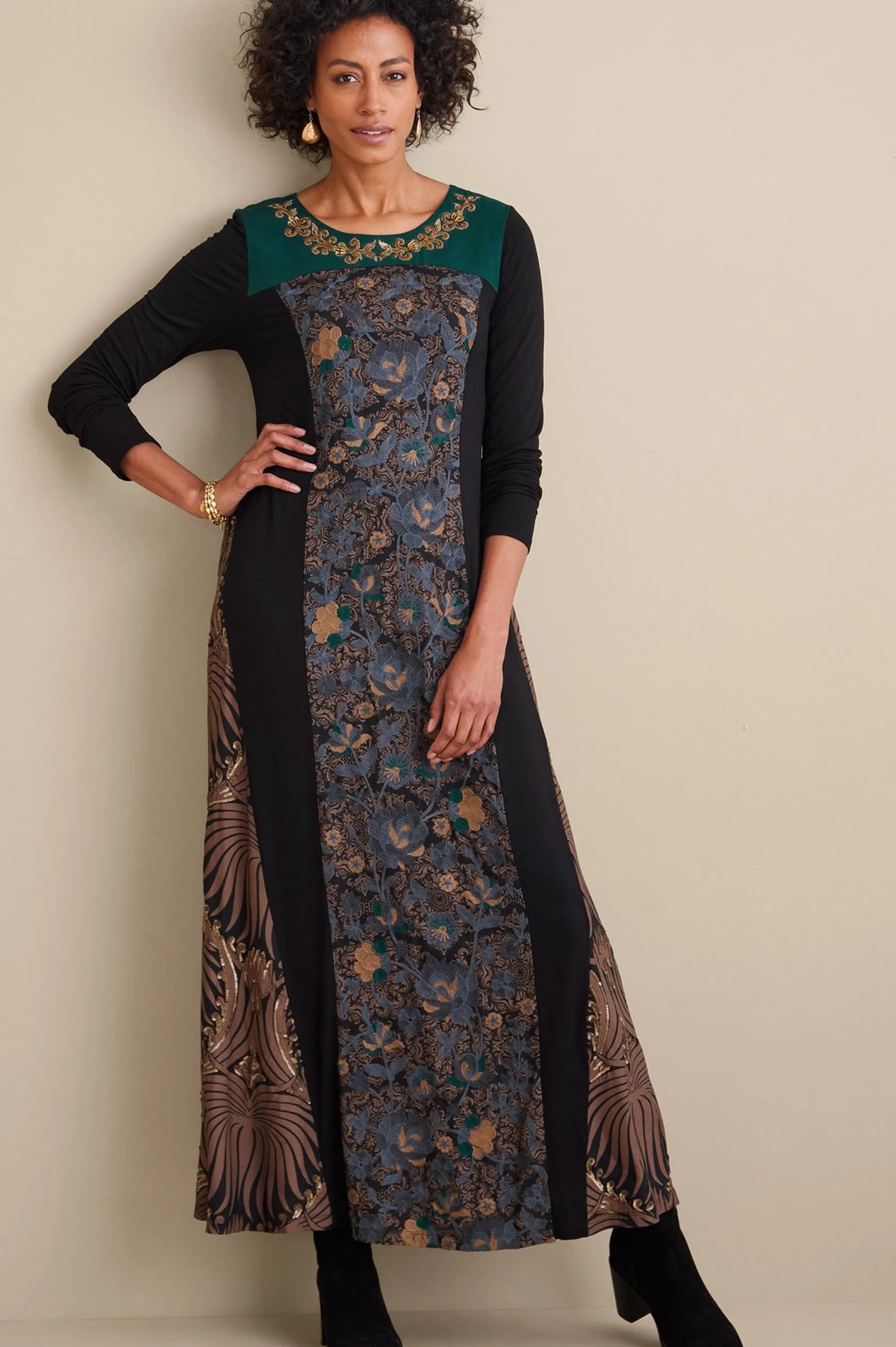 Utterly enchanting, a princess-seamed maxi with panels of challis, solid knit, and sequin-bedecked godets, with embroidered flourishes on front yoke and ¾-sleeves, and hidden center back zipper.