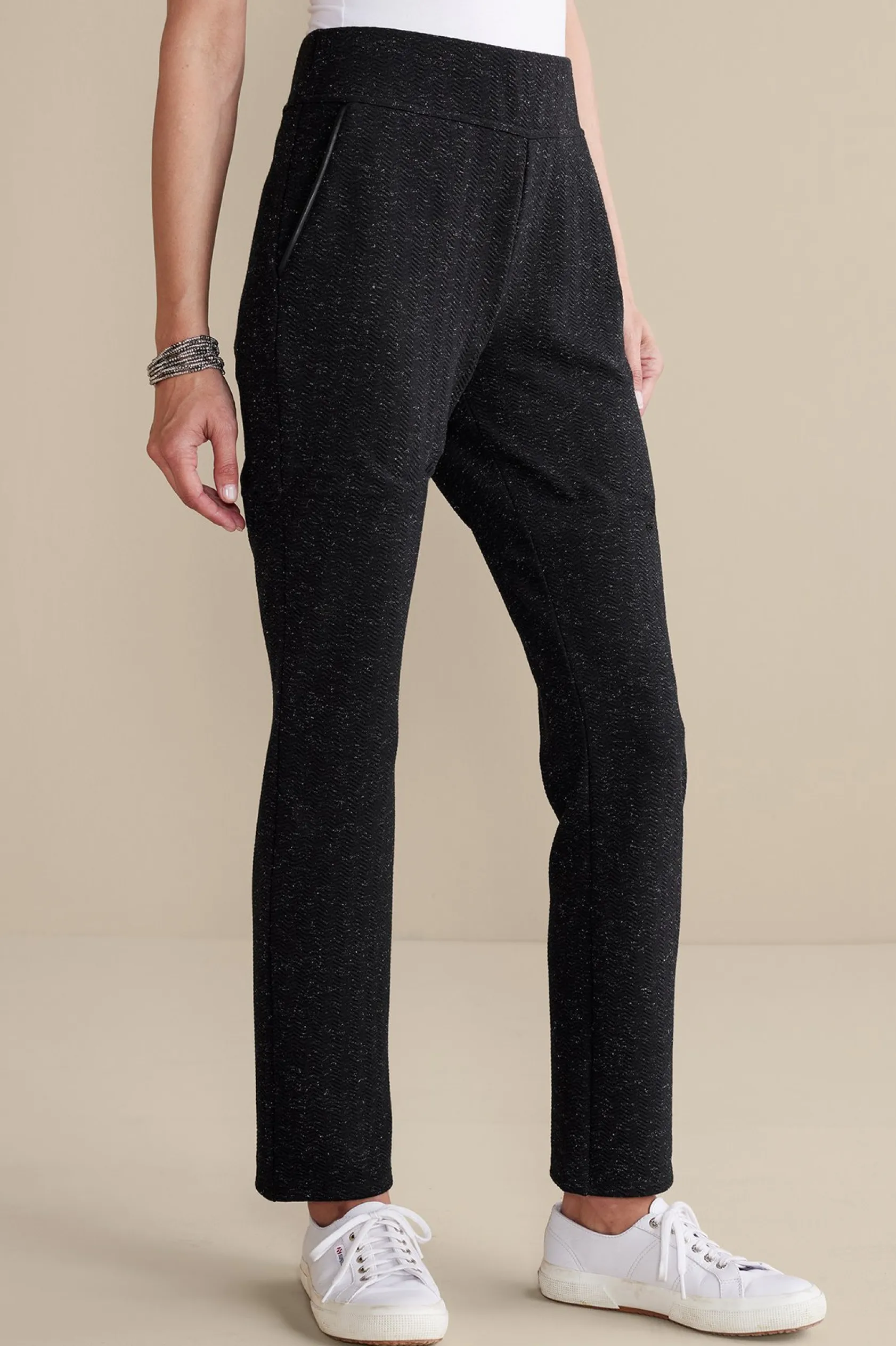 These pants perfectly balance festive shimmer and everyday ease. With twinkles of silver throughout the black chevron knit, you get gorgeous sparkle that’s easy to move, sit, and live in. The slim, ankle-length silhouette is finished with faux leather detailing at the pockets and a comfortable, full elastic waist. Pair with your favorite shirt or the matching Janae Top (2GA87). Misses inseam 28″.