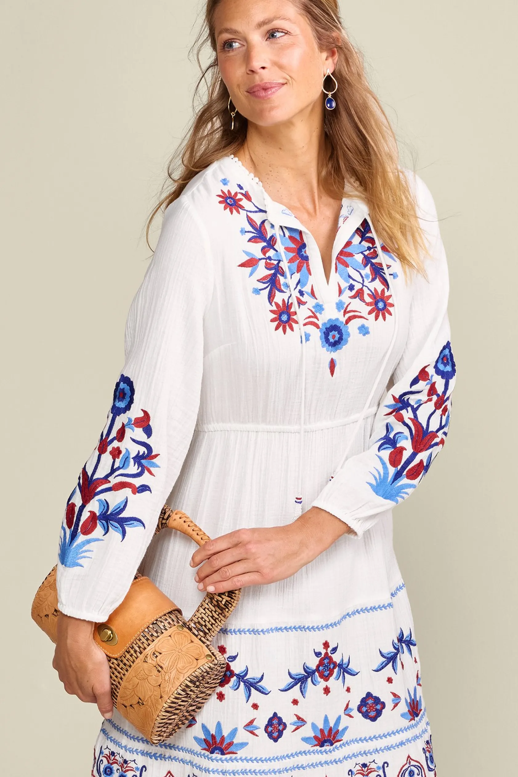 A cylinder clutch rounds out high-style lines and this summery edition bests the rest with a woven pandanus straw design and retro leather insets popped with tooled tropical flowers. Removable/adjustable shoulder strap converts the style to a crossbody (perfect for on-the-go days). Poly/cotton lining with small interior pocket. Metal closure.