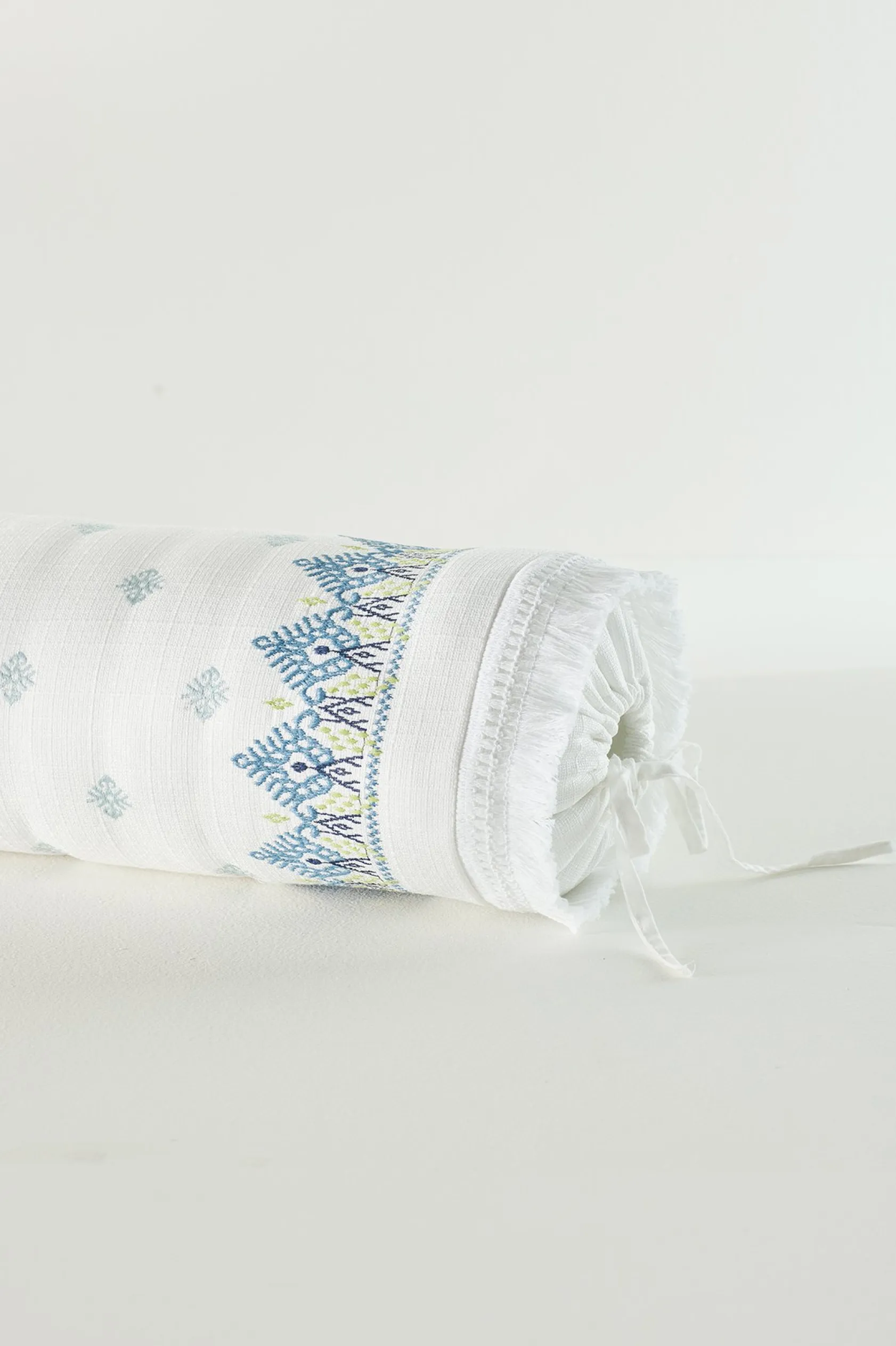 Dress your bed with the intricate design details of this rounded bolster pillow. Bands of colorful embroidery give way to lace trim at either end, with drawstring tassel ties adding a boho finishing flourish.