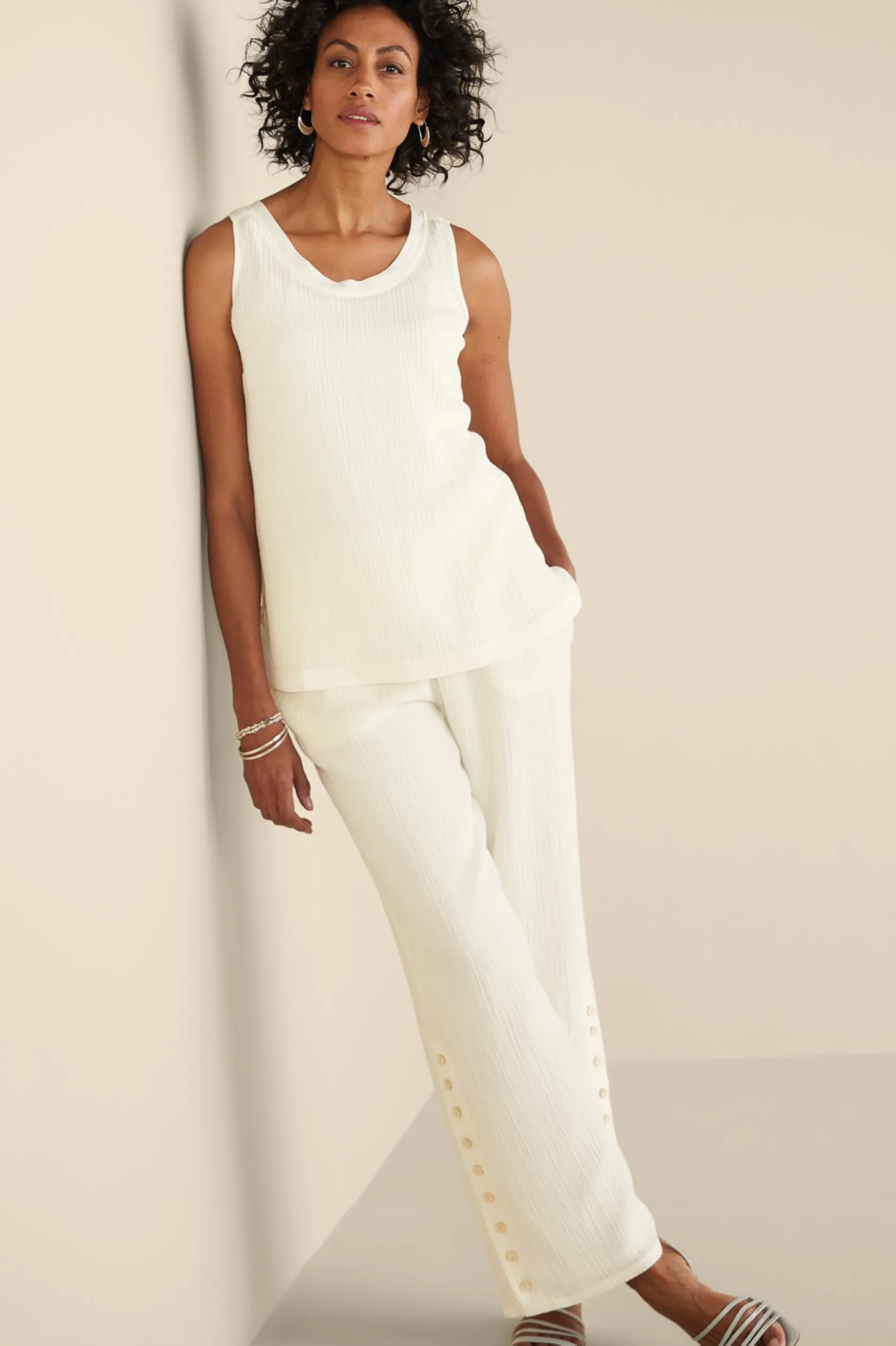 With its casual sensibility, gauze fabric keeps you feeling cool and carefree. Our signature gauze is crafted of the softest fibers, never scratchy. This gauze tank takes the staple into Soft territory with oodles of special details: a contrast woven neckline and a high-low tulip hem finished with wood-look button accents. The deep hems help it lay beautifully, wash after wash. A back yoke over shirring lends a breezy quality that we just adore in our gauze. Bust darts ensure a great fit. Wear Oceo Gauze from head-to-toe with the matching Wide-Leg Pants (2EW35) and Topper (2GD12).