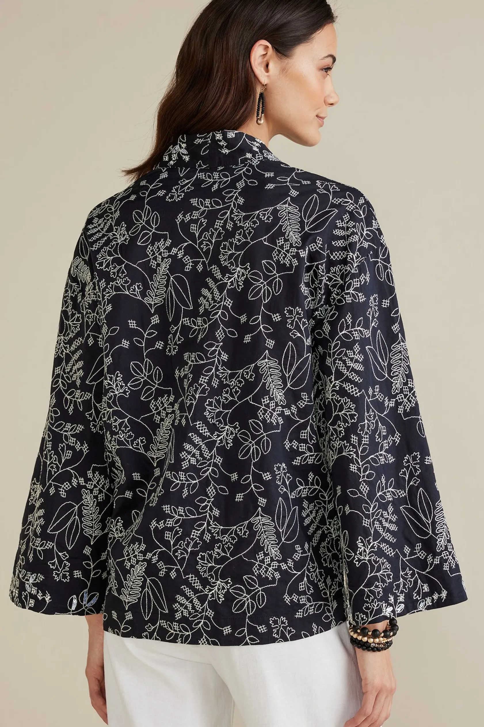 Allover contrast embroidery dresses this open-front topper in intricate detail. Its breezy, relaxed silhouette is accented by drop shoulders that flow into wide, drapey sleeves.