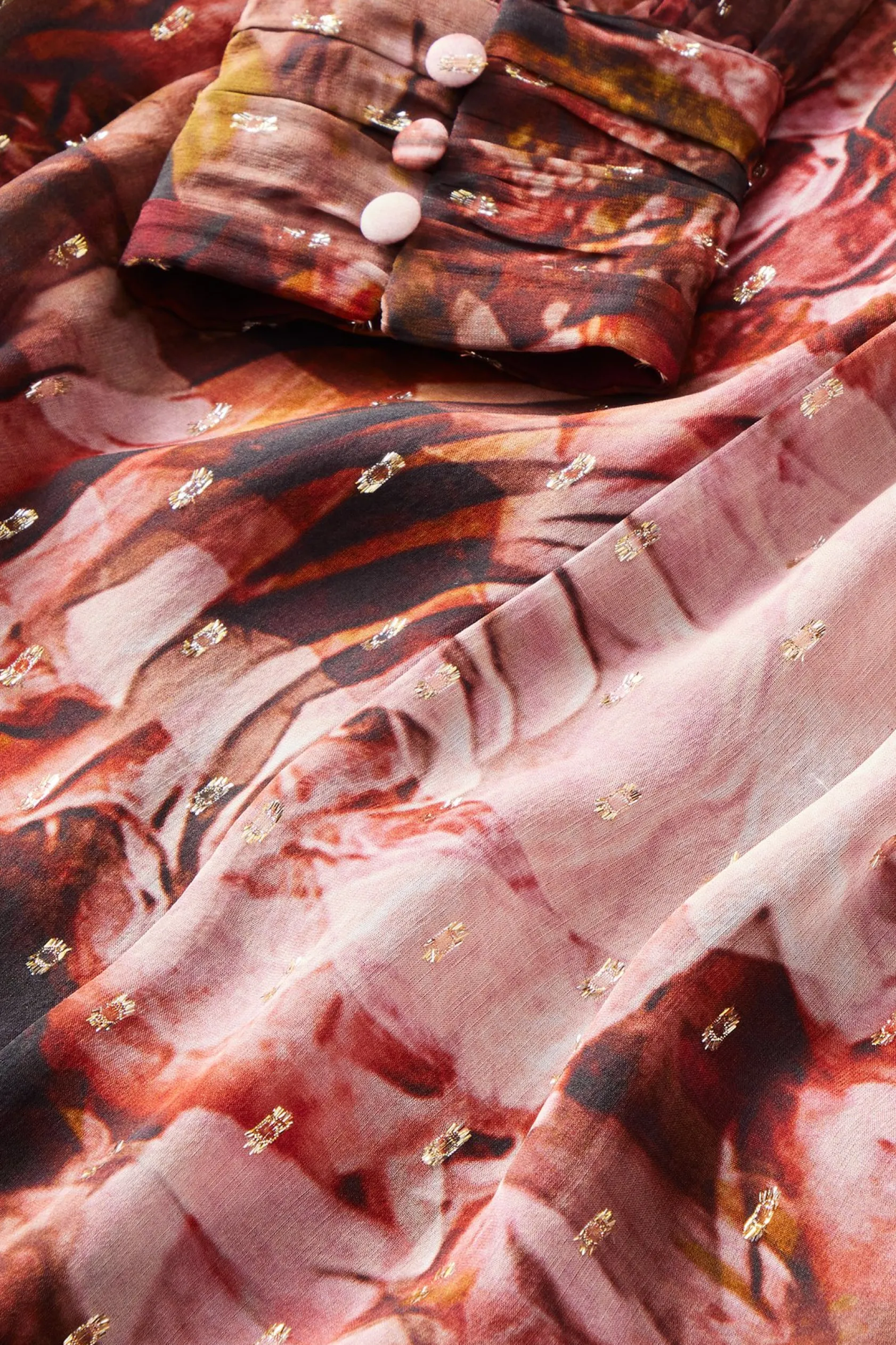 Painterly blooms in shades of rose and cabernet are gilded with shimmering details on this light and flowy silk dress. With sheer, button-cuff sleeves, its utterly feminine and luxe. Polyester crepe lining, invisible side zip.