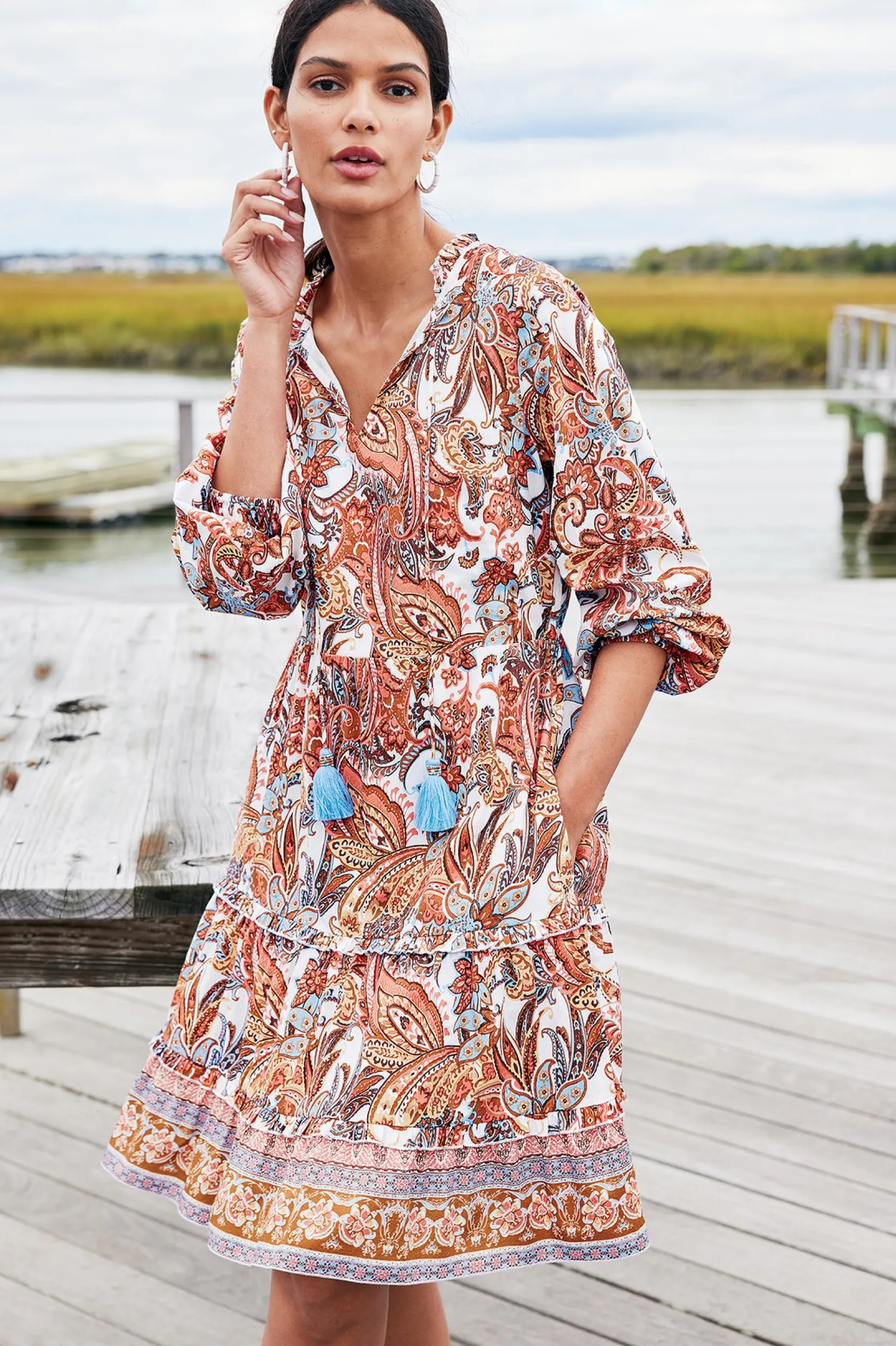 A playful print brightens this short and sweet tiered dress with long, blouson sleeves and a ruffled neckline with tassel accents.