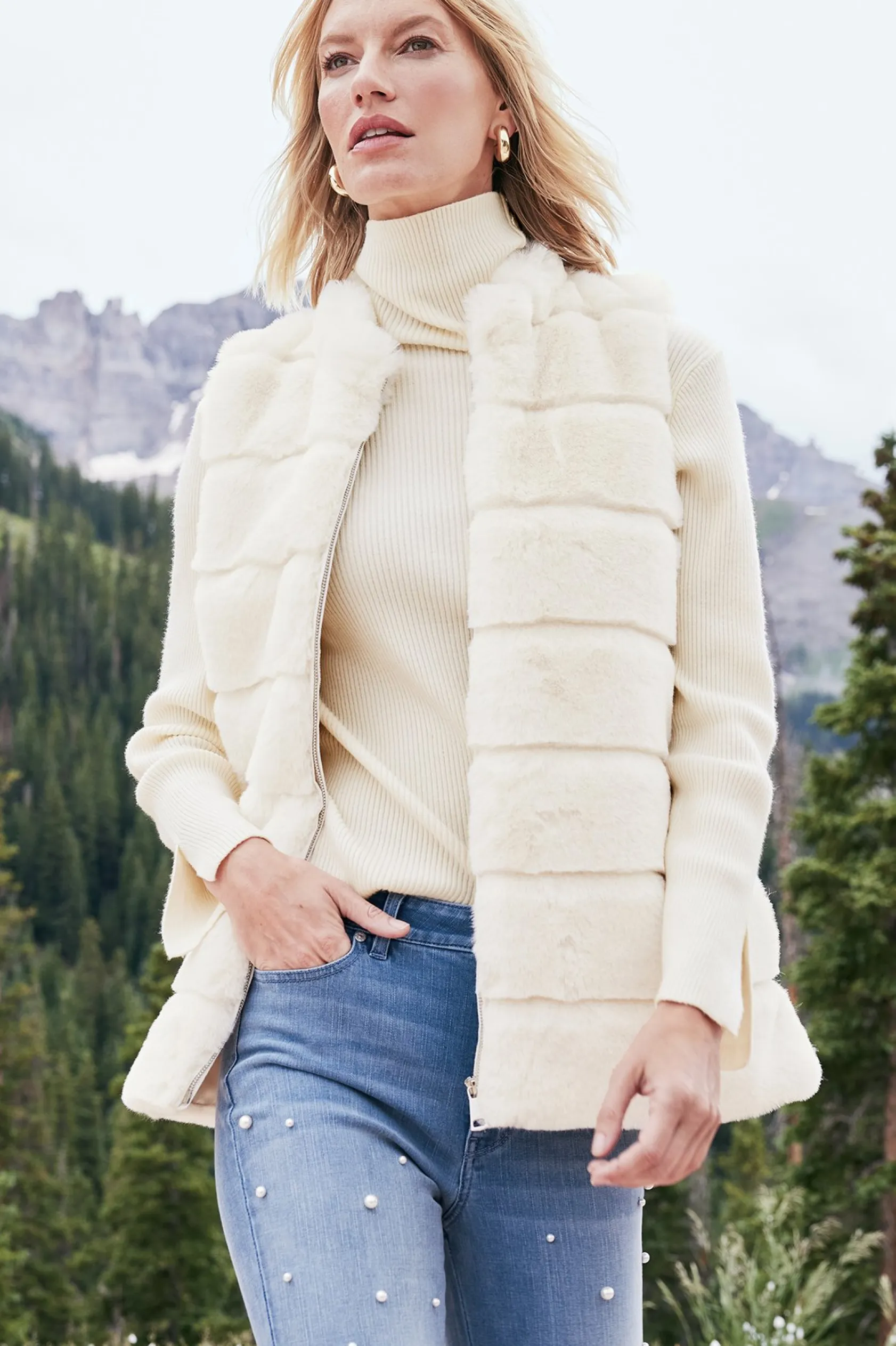 Snuggle up in the season’s softest layering piece. This tiered, tunic length vest is made from our luxe, touchably soft faux fur in a versatile shade of antique white. A stand collar, full zip, and side seam pockets complete this cozy look. Fully lined.