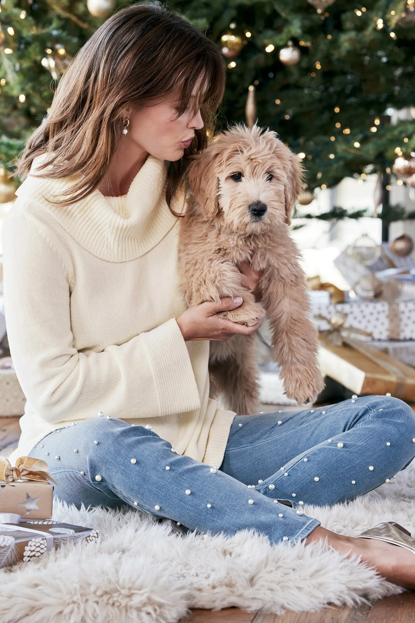 We gave our most beloved denim silhouette a luxe update, dusting it with pearl studs at the front and hem. (Don’t worry, you can still sit comfortably!) This classic straight leg style is made with premium four-way stretch for a comfortable and super-flattering fit. The five-pocket design sits at the natural waist and features a button-and-zip closure and belt loops. Misses inseam 28″.