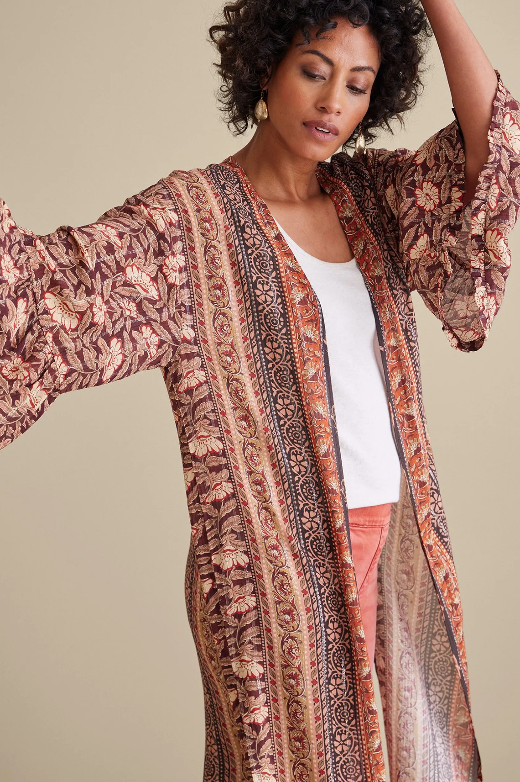 The warmth of summer still colors early fall days, calling for lightweight layers. This globally inspired topper is a beautiful look, featuring a mix of patterns enriched by deep hues of salmon, russet, ruby, and black. Details include ruffled bell sleeves, deep side slits, and triple bands of metallic stitching dripping from shoulder to hem for subtle shimmer. It’s a cool style designed to be worn open over jeans or jumpsuits.