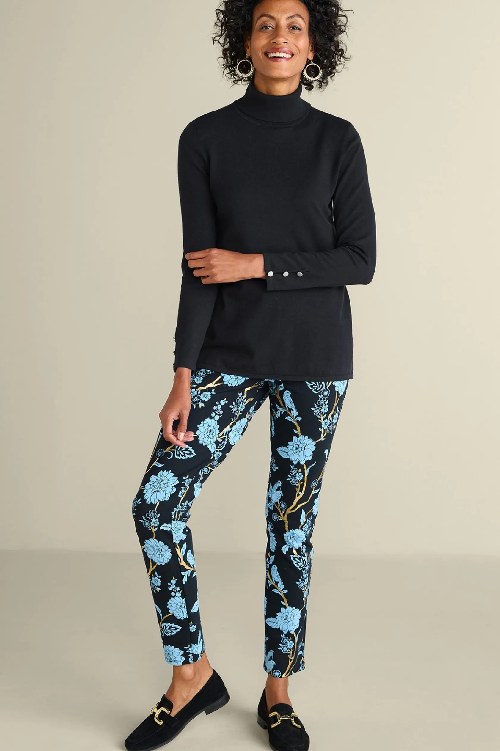 Slit sleeves with button detailing update your new favorite turtleneck sweater. Easy silhouette with side slits.