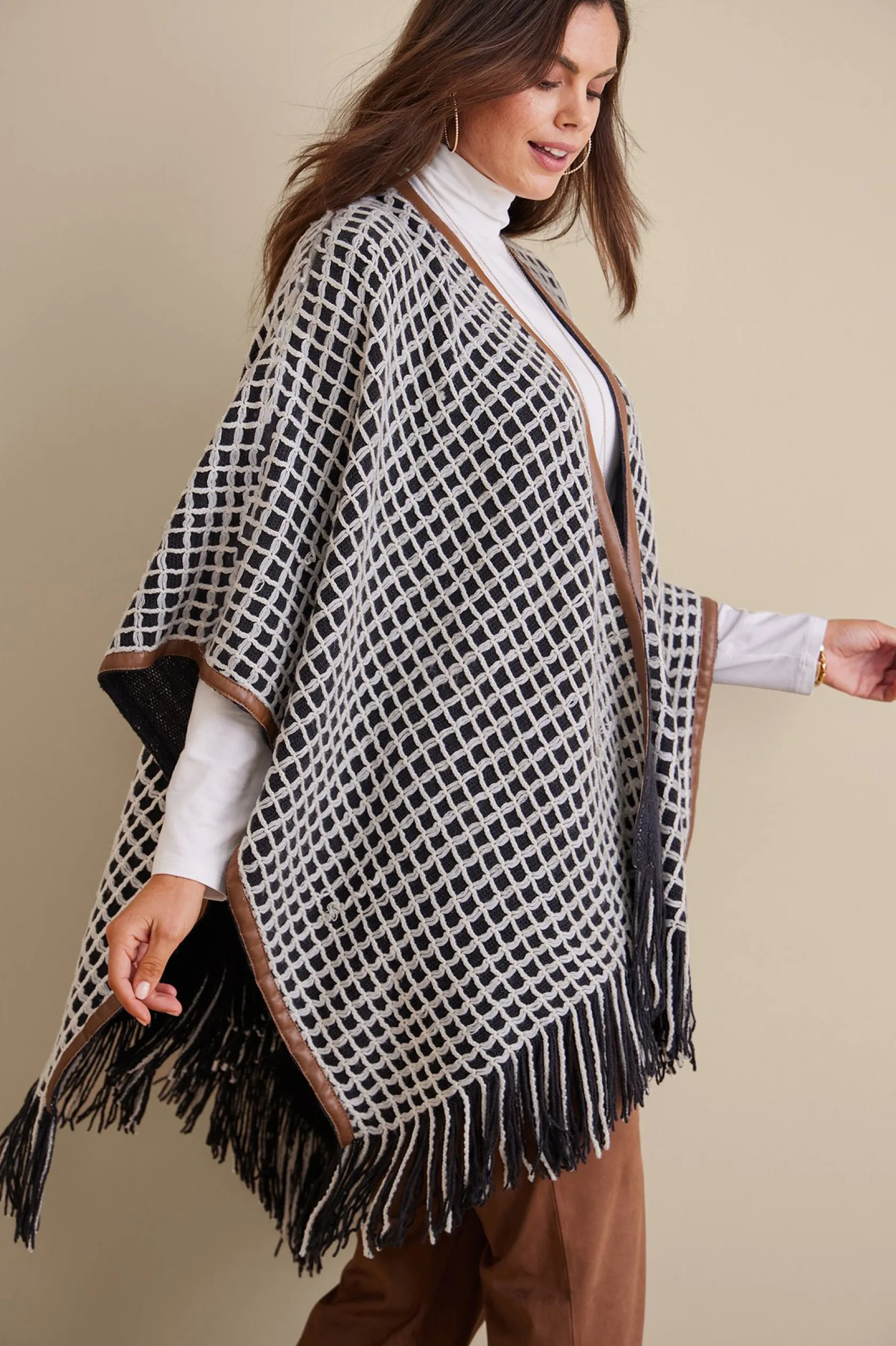 Snuggle into this generously sized plaid topper when you’re relaxing on the sofa, or wear it with jeans and boots for a chic outfit when you’re out and about this fall. Faux leather trim.