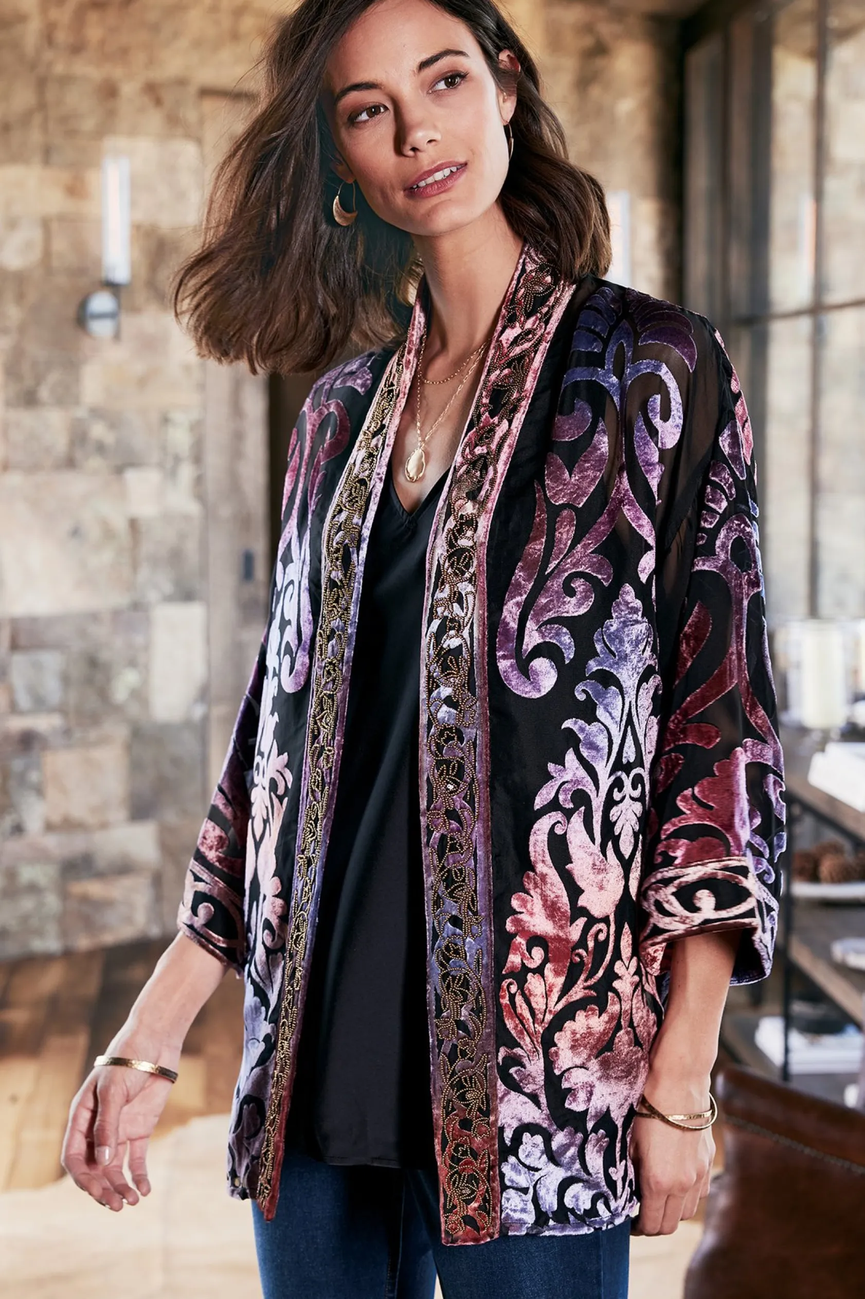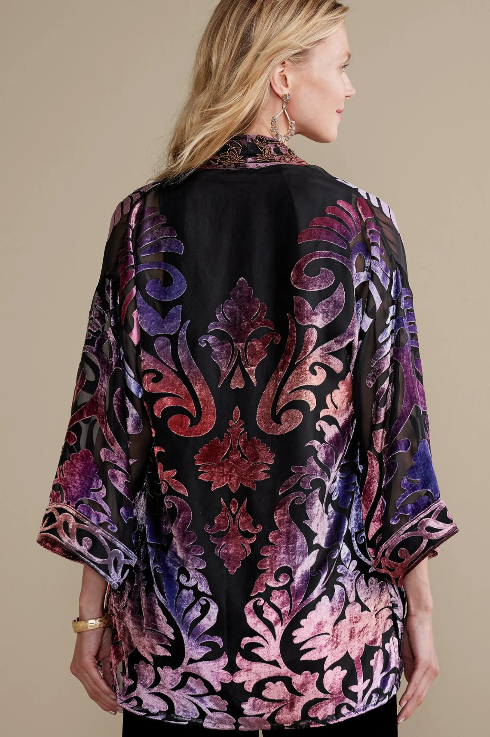 Simply. Stunning. This topper is a sheer delight with burnout velvet in ombre hues, shifting from lilac to deepest rose to wisteria. Hundreds of seed beads detail the open front for extra shimmer. But the real beauty lies in how effortlessly it elevates your whole wardrobe. Pair it with all black for easy elegance or go casually chic with a tank and jeans. 3/4 sleeves, side slits.