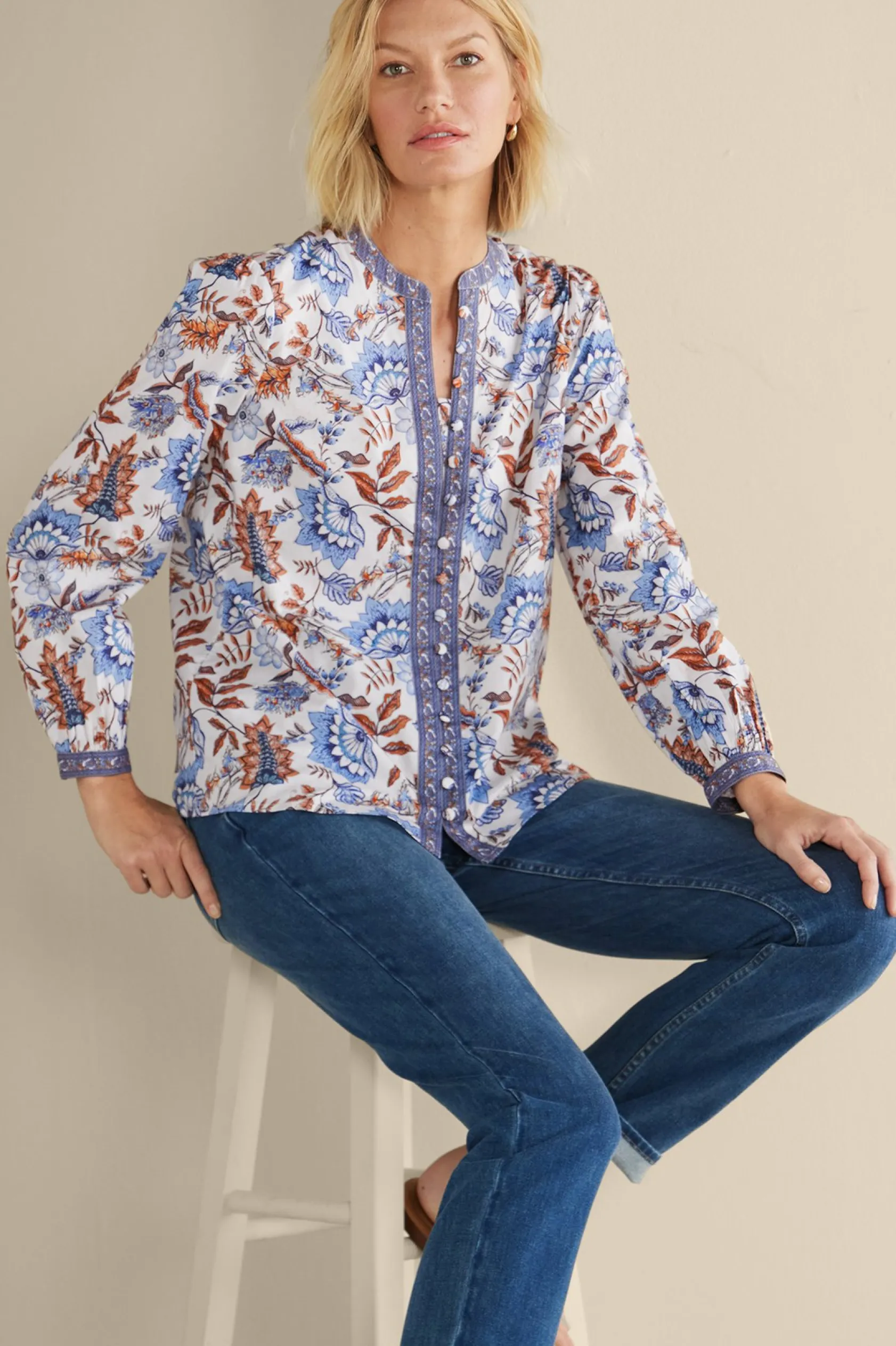 Wear this lightweight top through the warmer months with flowy pants and sandals, then take it into fall with jeans and boots. Printed in shades of blue and copper, it’s finished with a contrasting paisley border at the placket, Mandarin collar, and cuffs. Shirring at the sleeve cap adds volume for a subtle puff silhouette. Fully functional center button placket.